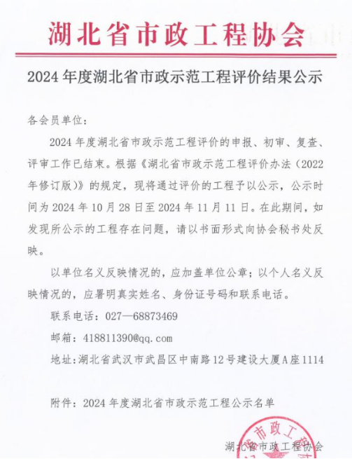 龙年将尽,再添佳绩。近日,湖北省市政工程协会公示了2024年度“湖北省市政示范工程”评价结果,由4008云顶集团游戏平台投资、天鼎市政公司承建的荆门市漳河新区谭店新社区道路、给水、排水及配套工程EPC总承包项目荣获2024年度“湖北省市政项目示范工程”称号。